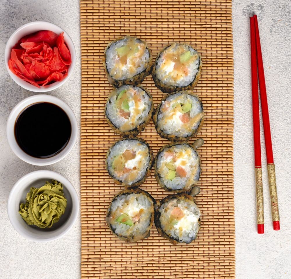 Лосось, сыр сливочный, авокадо, соус ореховый, рис, водоросли нори
