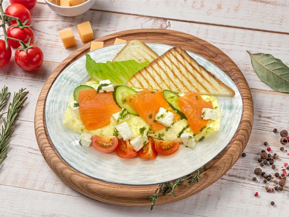 Желток и белок пастеризованные, форель или лосось слабосоленый, огурцы, томаты черри, сыр фета, микс салатных листьев, пшеничный тост, соус песто.