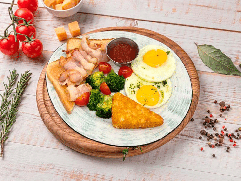 Желток и белок пастеризованные, капуста брокколи, томаты черри, хрустящий бекон , картофельный драник, соус песто , соус по- грузински
