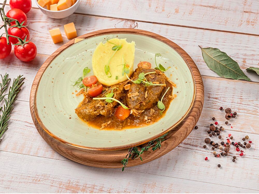 Томленые говяжьи щечки в соусе Демиглас, картофельное пюре, томаты черри, зелень.