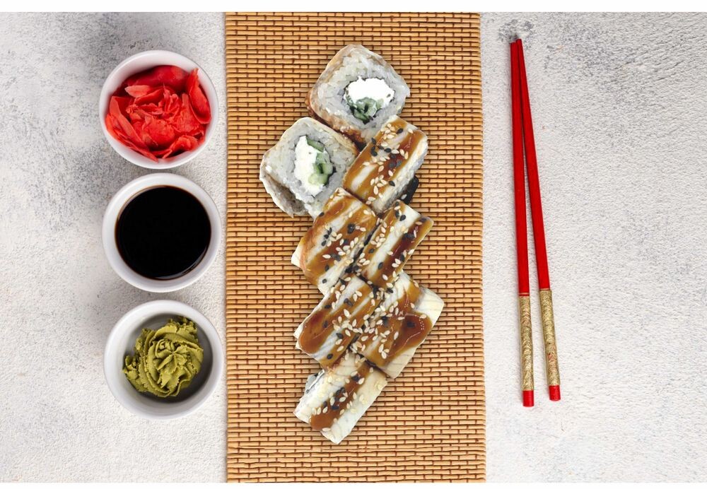 Угорь жареный, сыр сливочный, соус унаги, огурец, кунжут, рис, водоросли нори