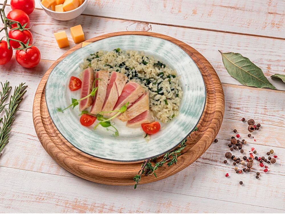 Тунец на гриле, рис, шпинат листовой, томаты черри, зелень.