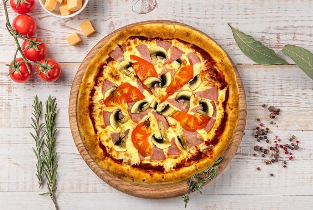 Ветчина, шампиньоны, томатный соус, сыр моцарелла.