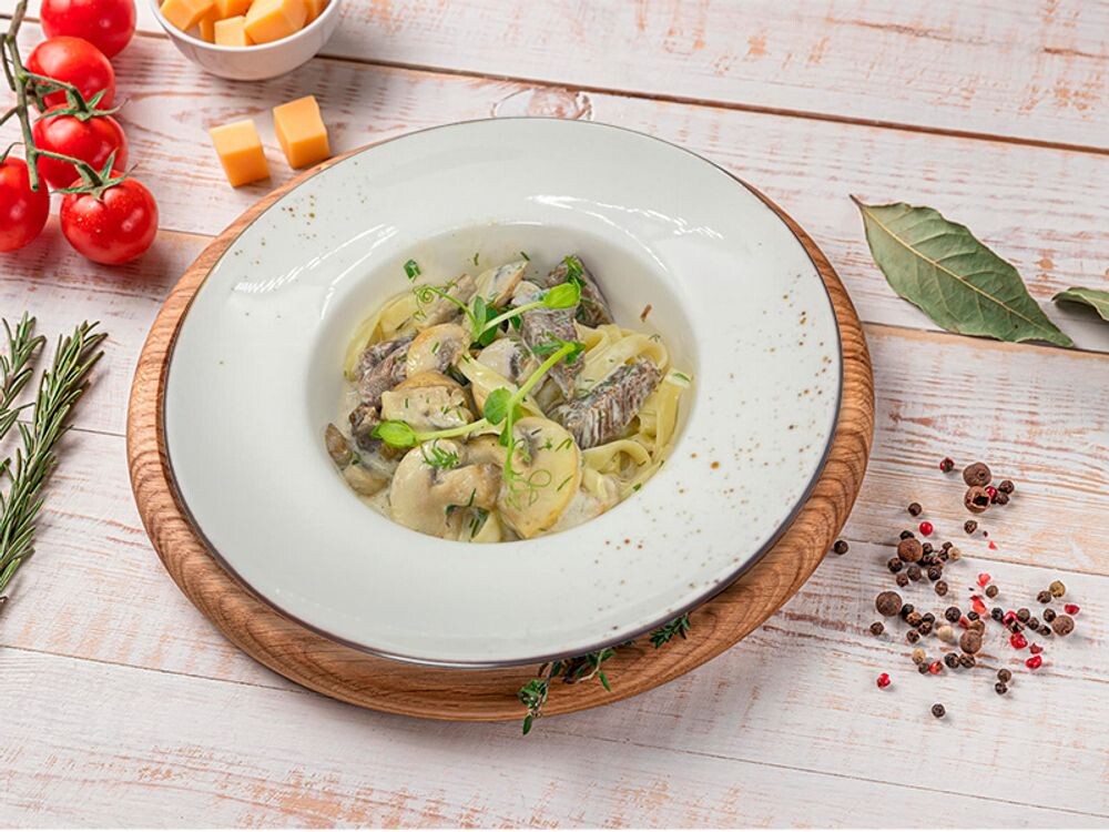 Паста тальятелле, сливочный соус, говяжьи щечки, шампиньоны, зелень, сыр пармезан, томаты черри.