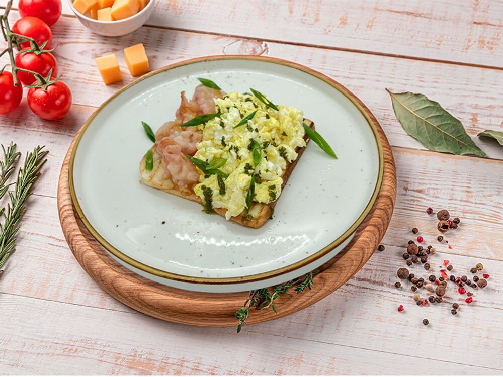 Желток и белок пастеризованные, бекон жареный, пшеничный тост, зеленый лук.
