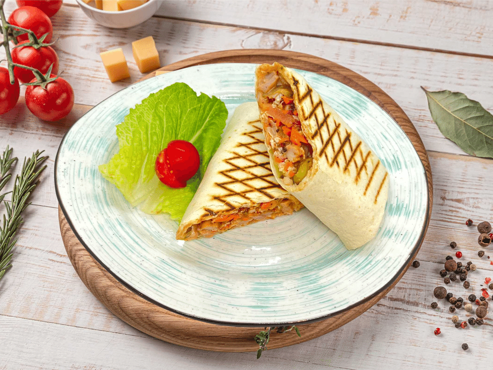 Куриное бедро, лепешка тортилья, микс салатных листьев, маринованные огурцы, красный лук, томаты, белый соус.