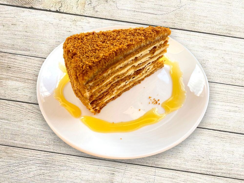 Песочные коржи, мед, заварной крем, ванилин.