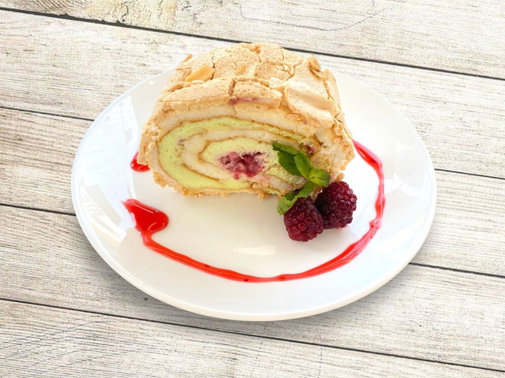 Воздушный меренговый или бисквитный рулет, сливочный крем с добавлением малины, миндаль, ванилин