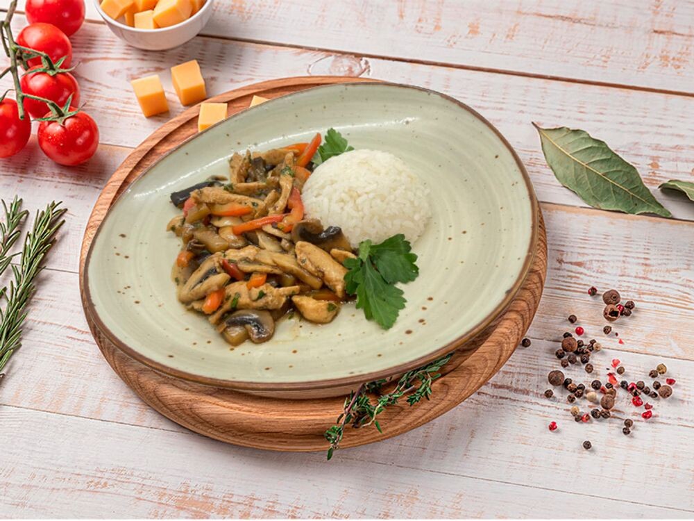 Куриная грудка, перец красный болгарский, баклажан, шампиньоны, соус терияки, зелень, рис.