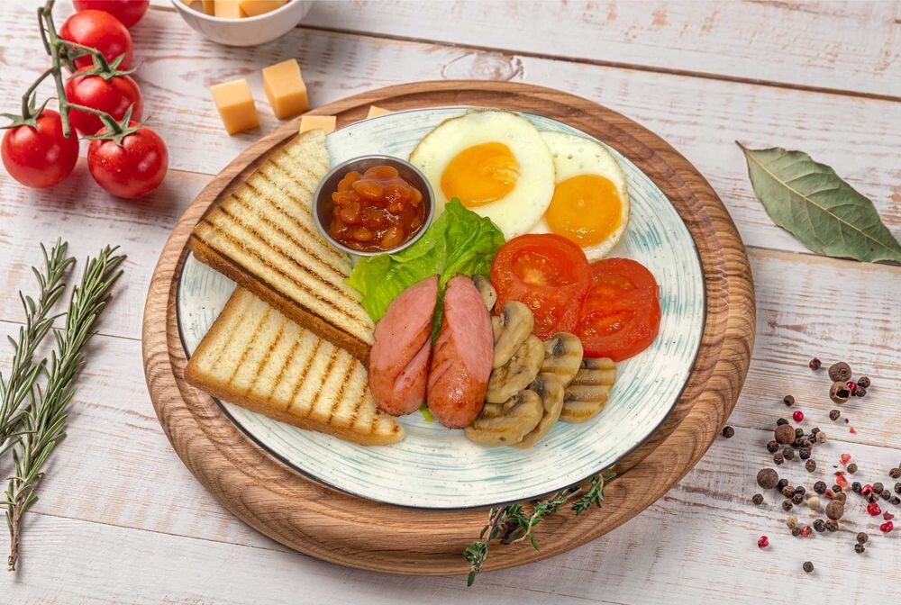 Желток и белок пастеризованные, сосиска жареная, томаты гриль, шампиньоны гриль, соус по-грузински, пшеничный тост, микс салатных листьев.