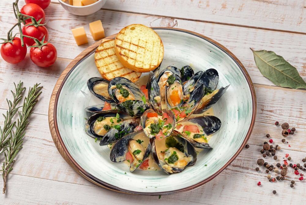 Мидии томленные в сливочном соусе, устричный соус, сыр пармезан, томаты, белая булочка на гриле, лимон, паприка, соус песто, зелень.