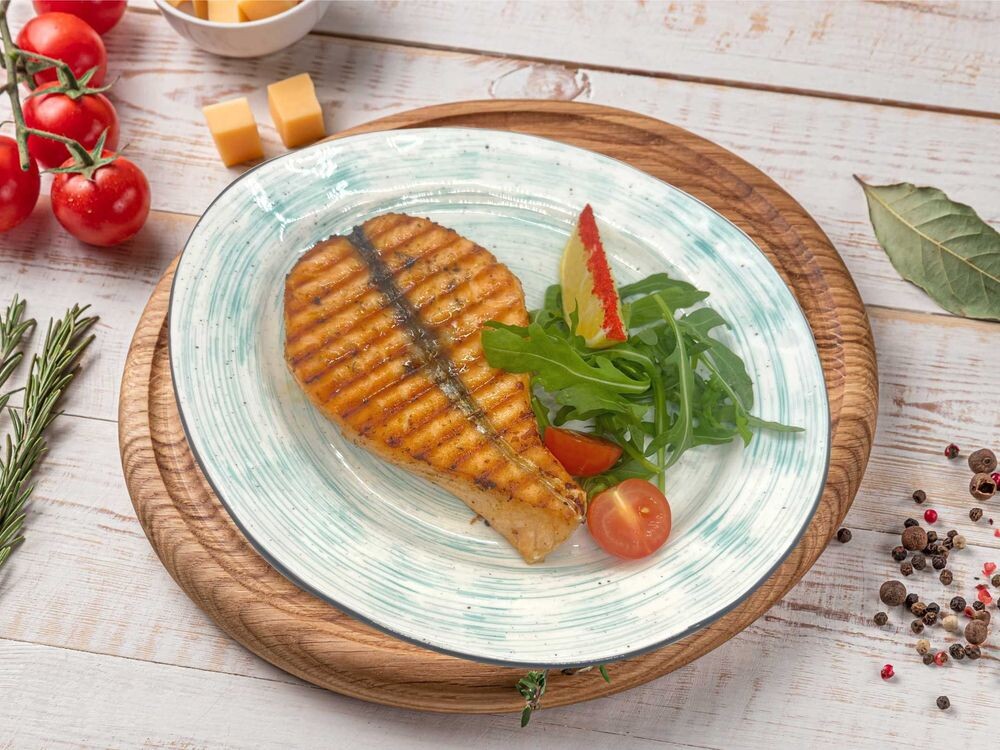 Филе лосося, руккола, томаты черии, лимон, паприка.