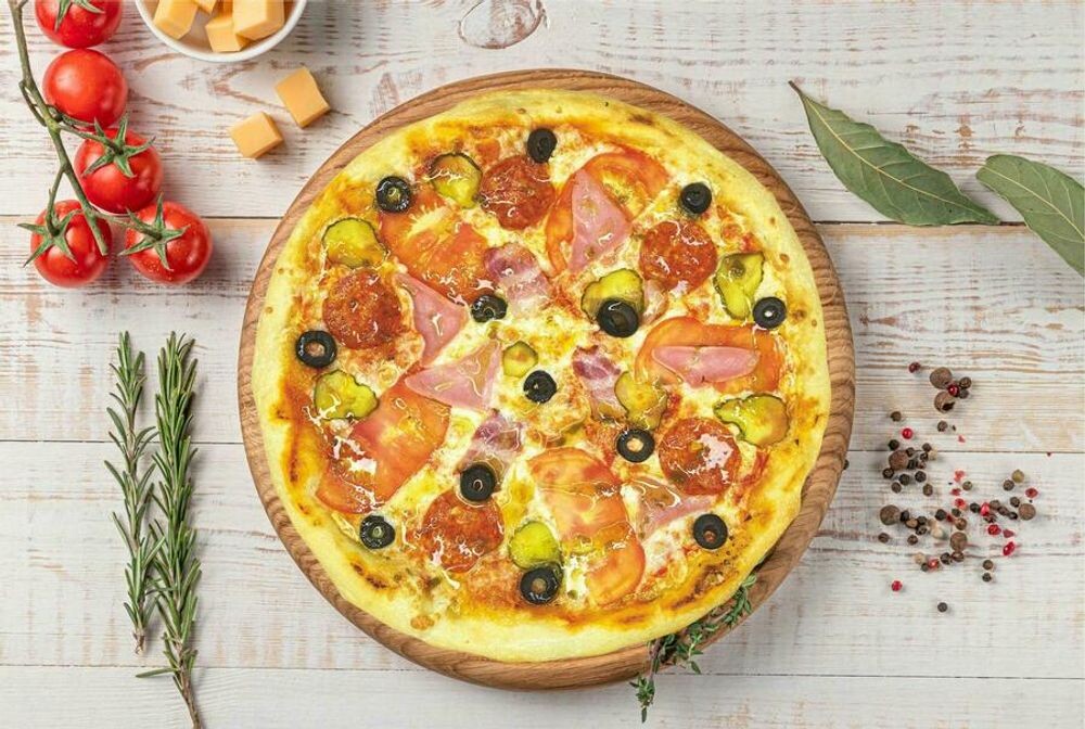 Ветчина, колбаса пеперони, бекон, томатный соус, сыр моцарелла, маринованные огурцы, маслины, томаты.